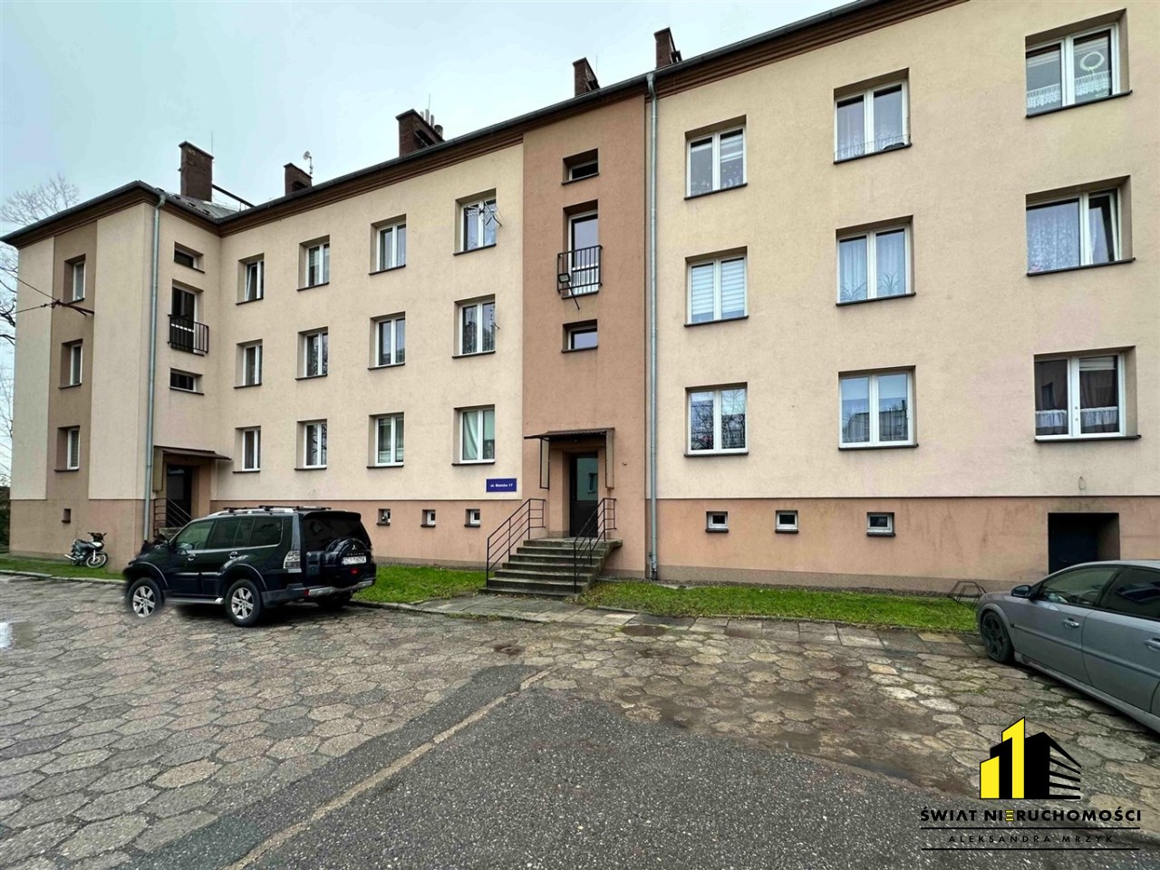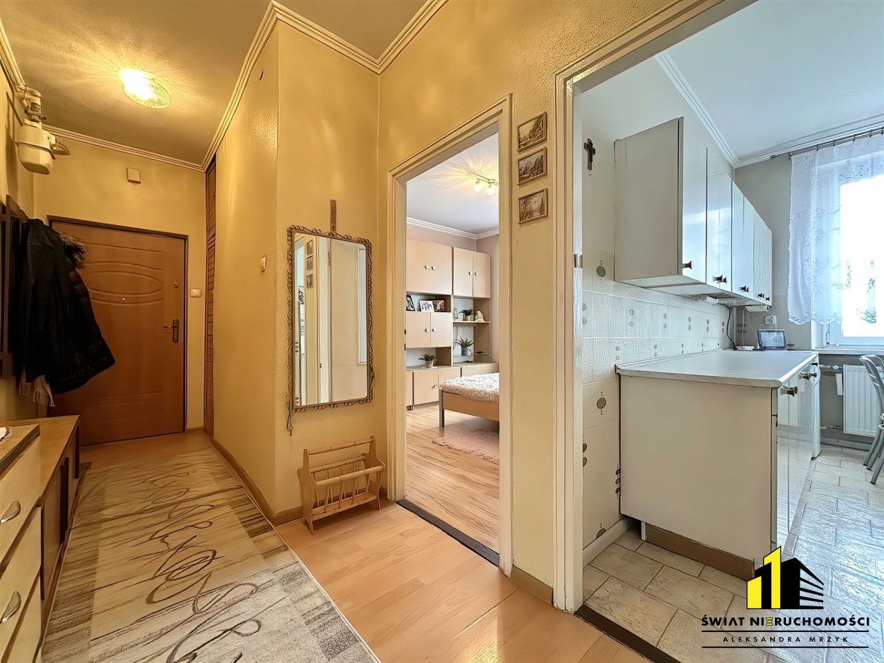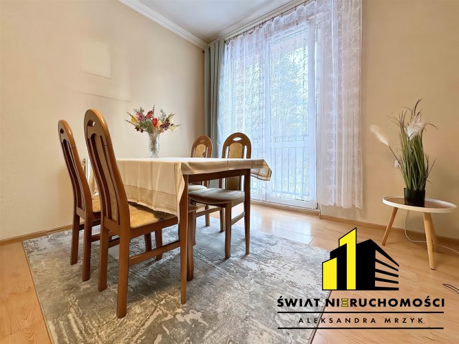 Mieszkanie składa się z: salonu z wyjściem na balkon, sypialni, dużej kuchni, przedpokoju z oraz łazienki z wc. Do mieszkania przynależy duża piwnica o powierzchni 8,6m2