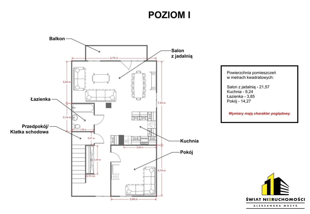 - salon z jadalnią i kuchnią – przestronna, jasna strefa dzienna z wyjściem na balkon oraz widokiem na ogród