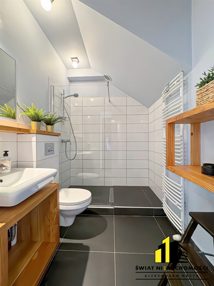 - łazienka z prysznicem oraz wc