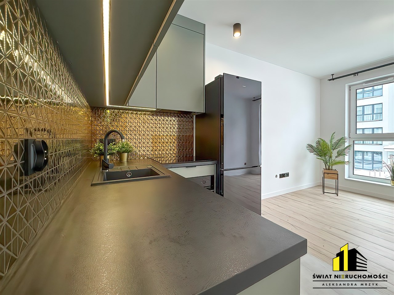 Mieszkanie posiada otwartą przestrzeń dzienną z aneksem kuchennym.
