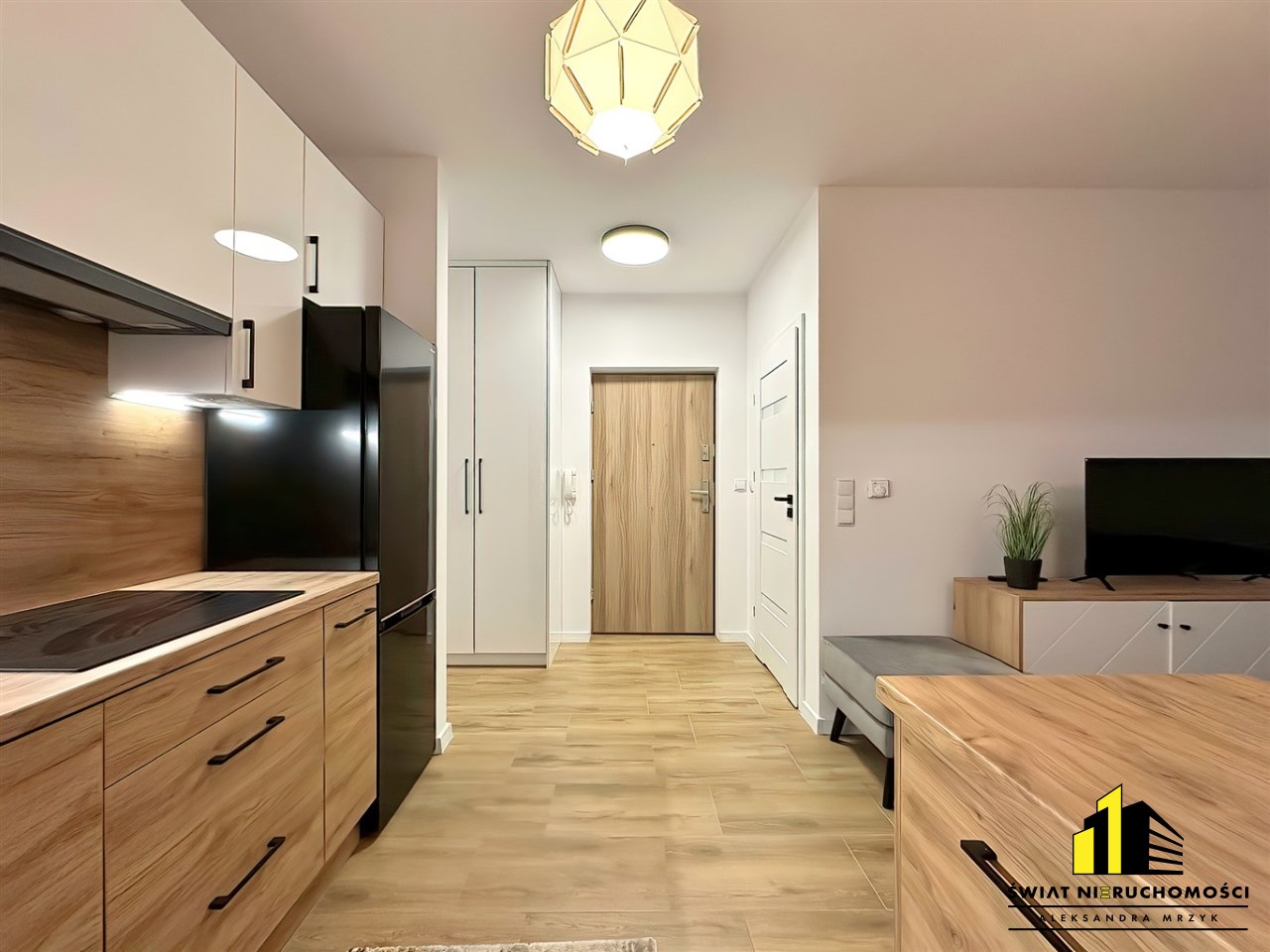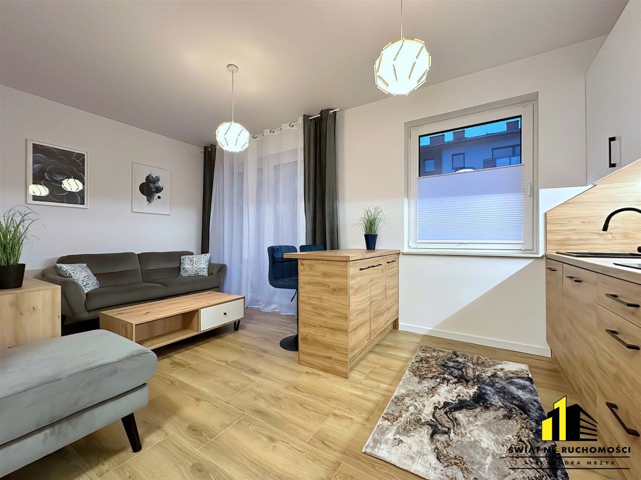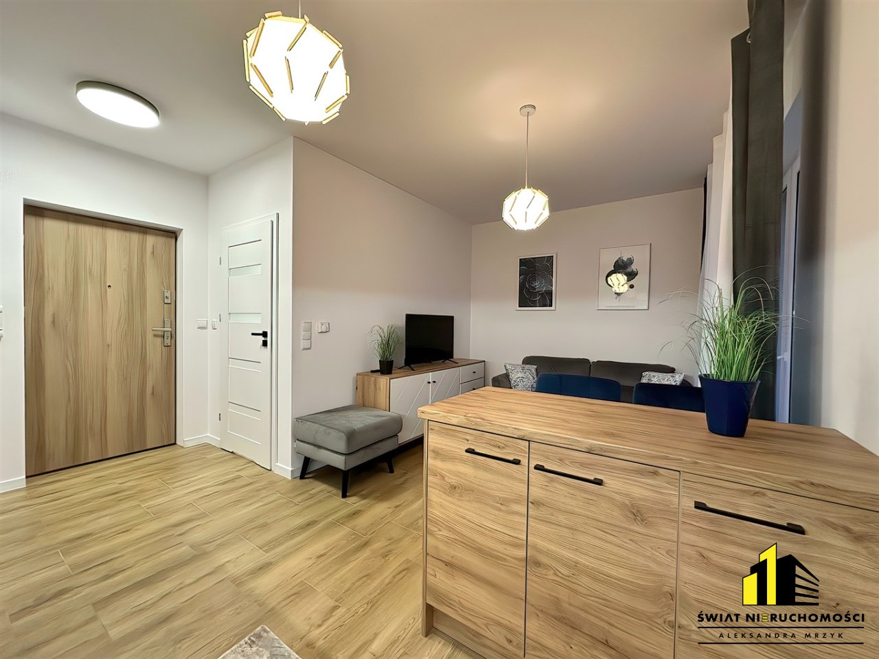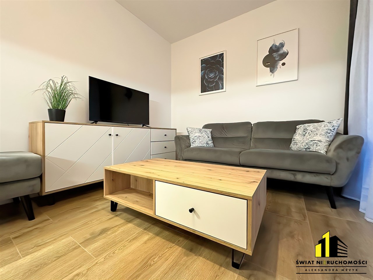 - Salon z kuchnią - kuchnia wyposażona w meble kuchenne wraz ze sprzętami AGD oraz pralką, w salonie wypoczynek, stolik kawowy, połka pod tv oraz telewizor. Z salonu wyjście na duży balkon.