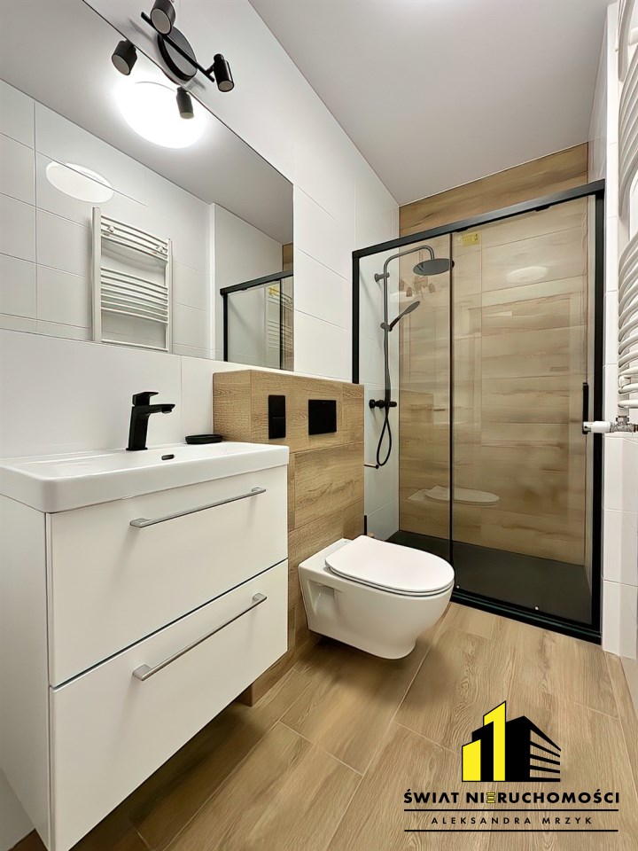 - Łazienka wraz z wc – prysznic, duża szafka pod umywalką, umywalka.