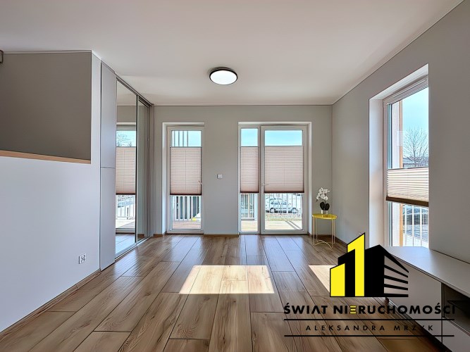 Kawalerka o powierzchni 31 m2 jest częściowo umeblowana i wyposażona w lodówkę, pralkę, piekarnik oraz płytę indukcyjną. Mieszkanie składa się z pokoju połączonego z aneksem kuchennym, garderoby oraz łazienki z WC. Posiada również duży balkon, idealny do relaksu na świeżym powietrzu.