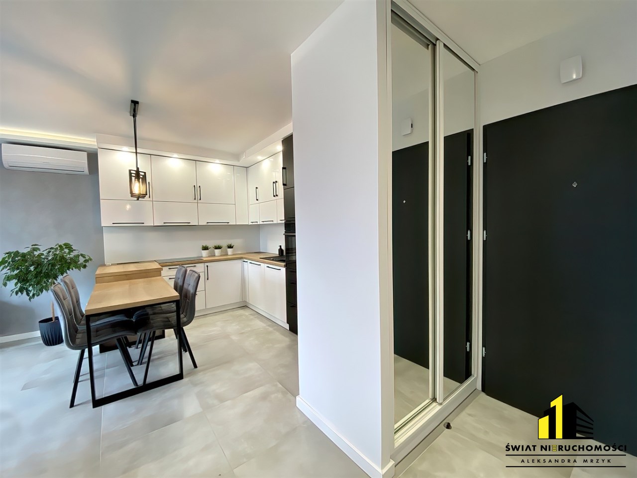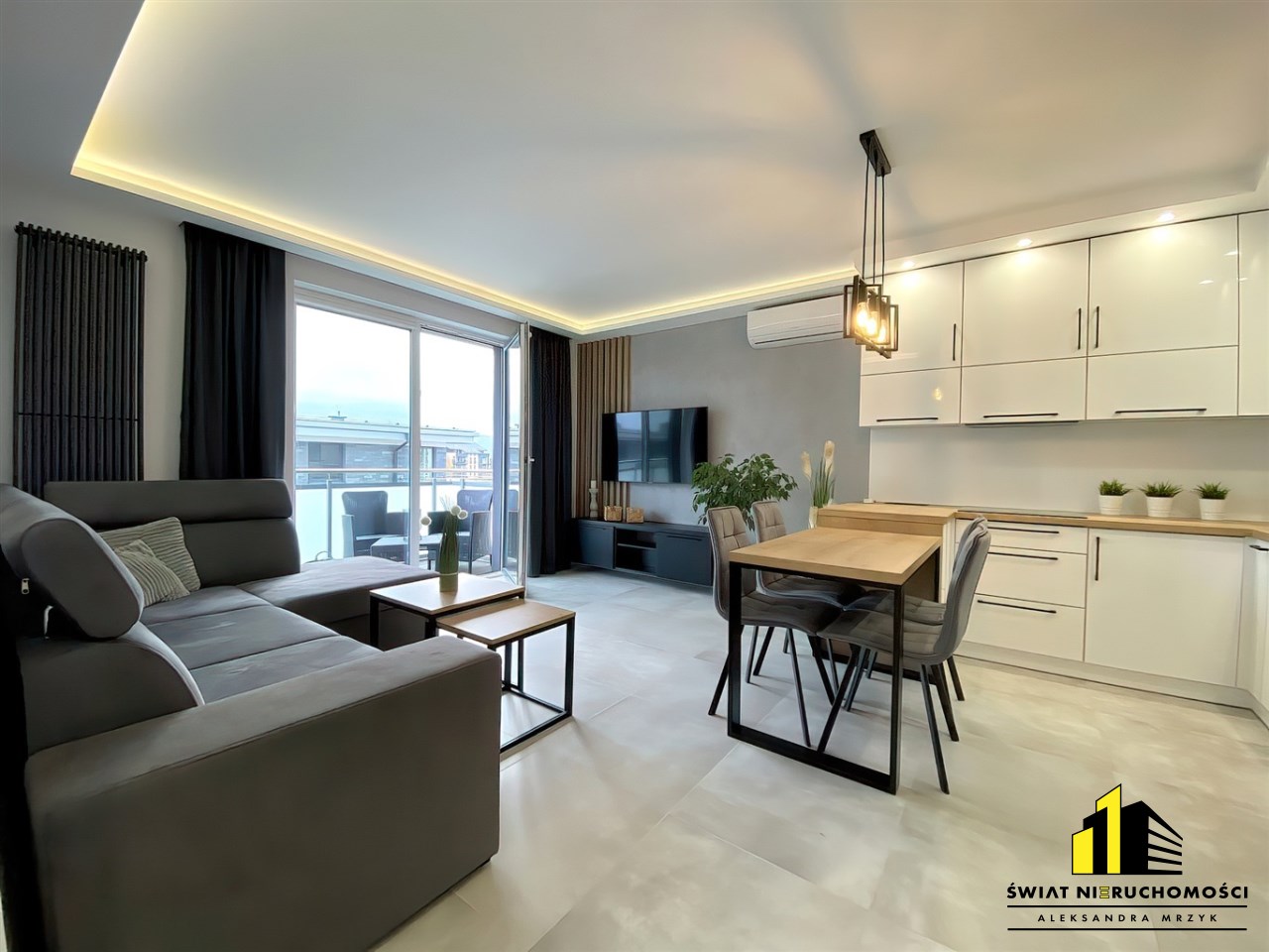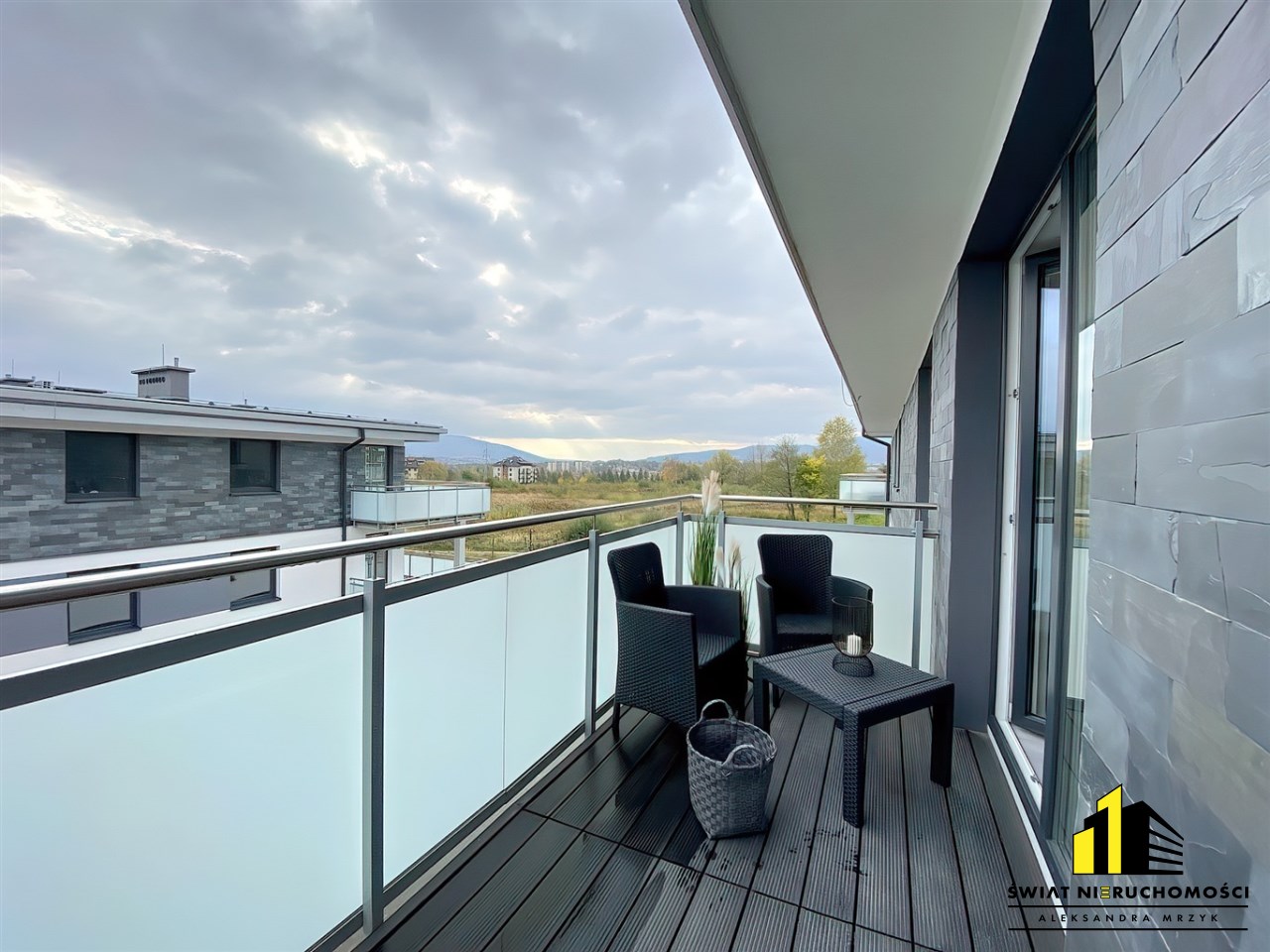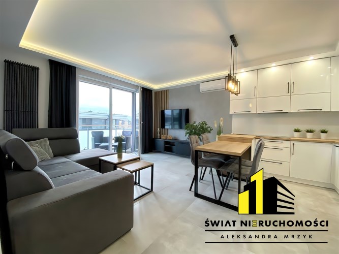 Do dyspozycji nowego Najemcy są dwie duże szafy, jedna w przedpokoju druga w sypialni, wygodne łóżko małżeńskie, rozkładana rogówka w salonie, TV. Piękna kuchnia wyposażona we wszystkie niezbędne sprzęty AGD, stół z krzesłami, komplet wypoczynkowy na balkonie z którego roztacza się ładny widok na pasmo gór oraz łazienka z zabudową stolarską oferująca pojemne szafki wyposażona w pralko-suszarkę. Prócz tego Wynajmujący zamontował w mieszkaniu klimatyzację, co w upalne dni pozwoli cieszyć się przyjemnym chłodem.
