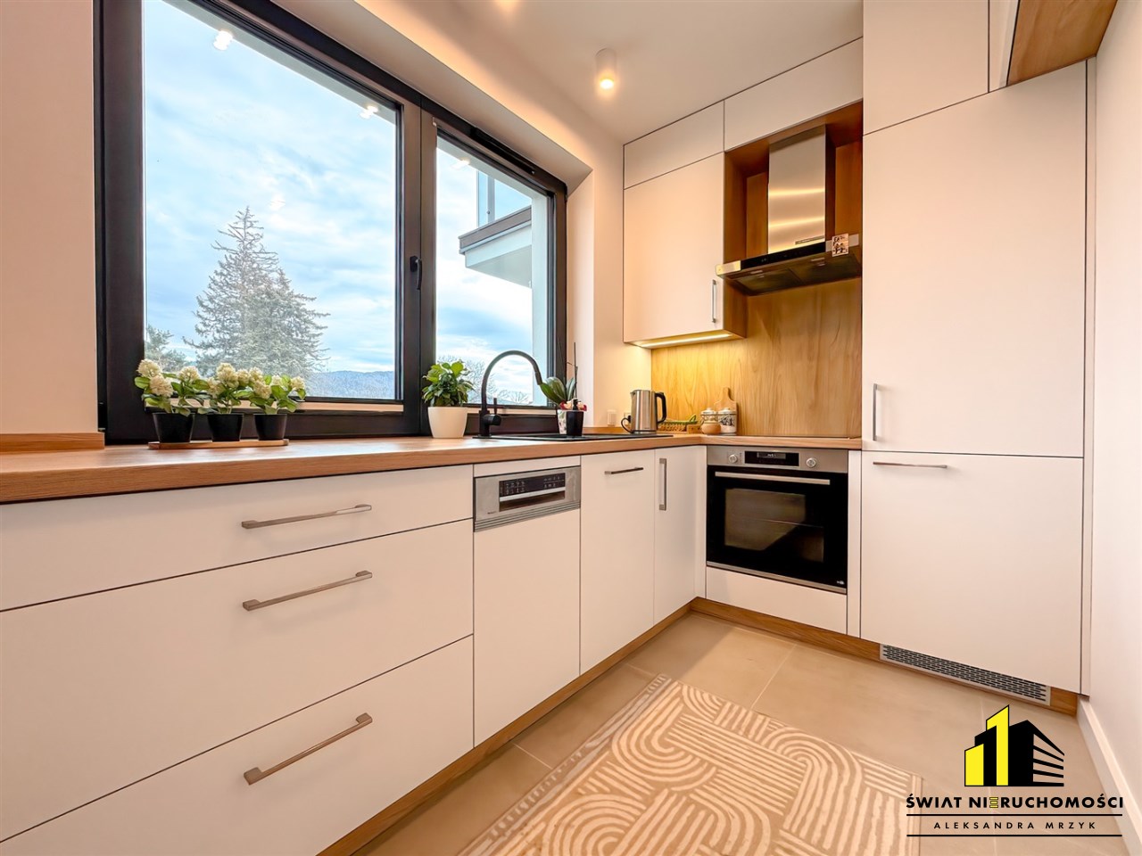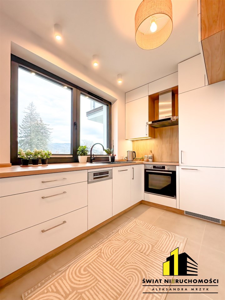 - Kuchnia: zabudowana na wymiar, wyposażona w zmywarkę, piekarnik i lodówkę.