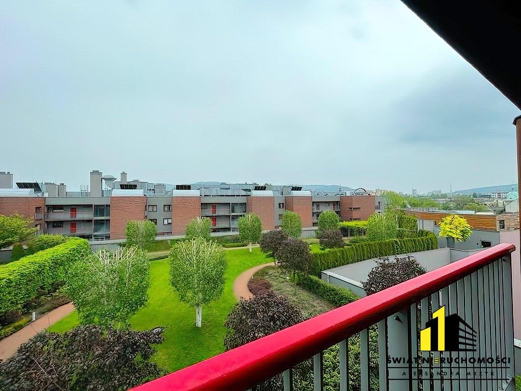 Z salonu wyjście na balkon z widokiem na ogród na dachy SFERY