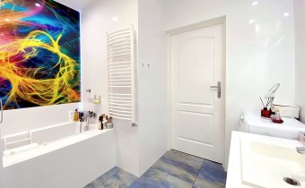 Łazienka z wanną, wykończona wysokiej jakości materiałami oraz elementami z szkła hartowanego .