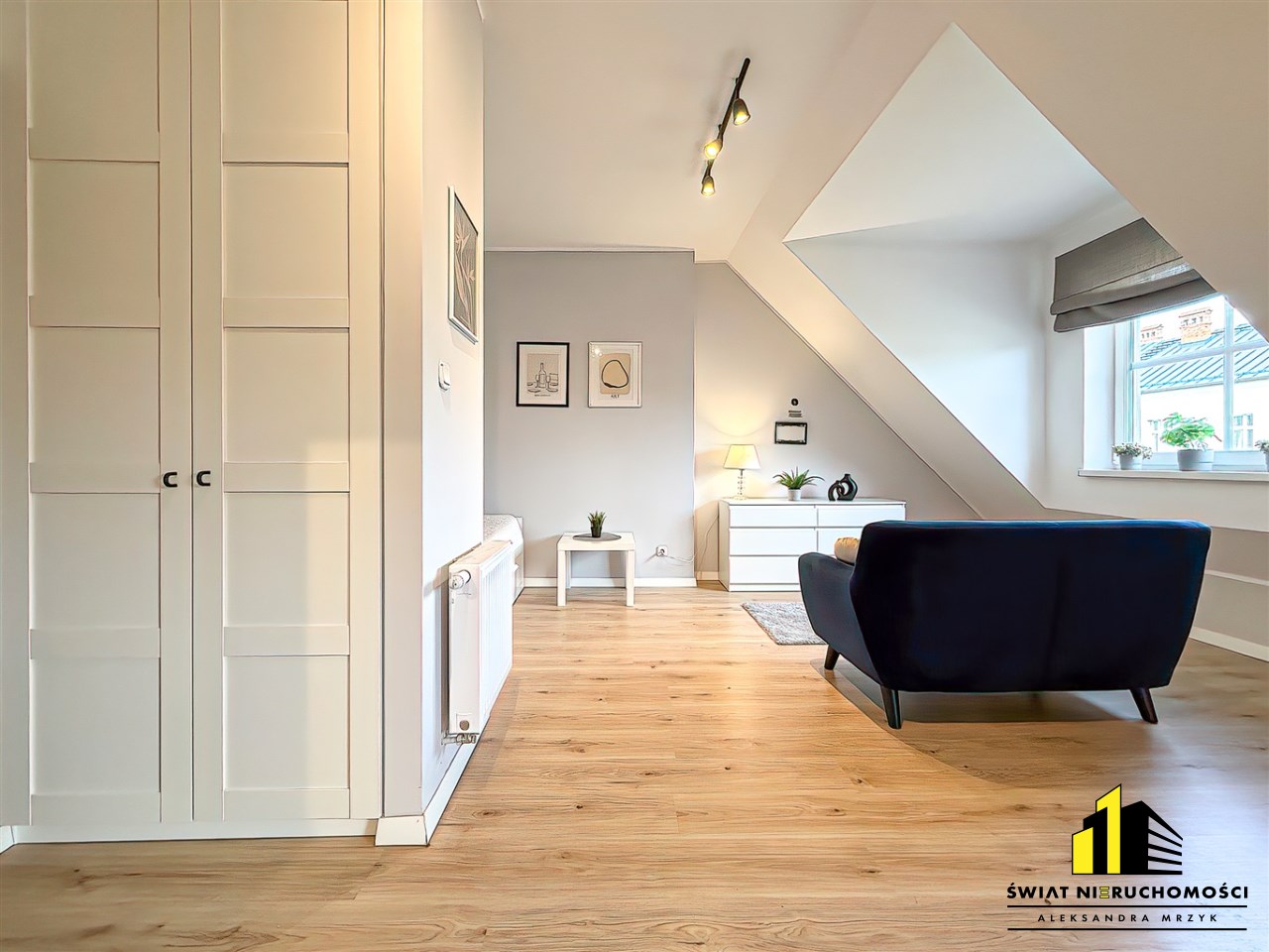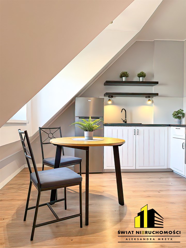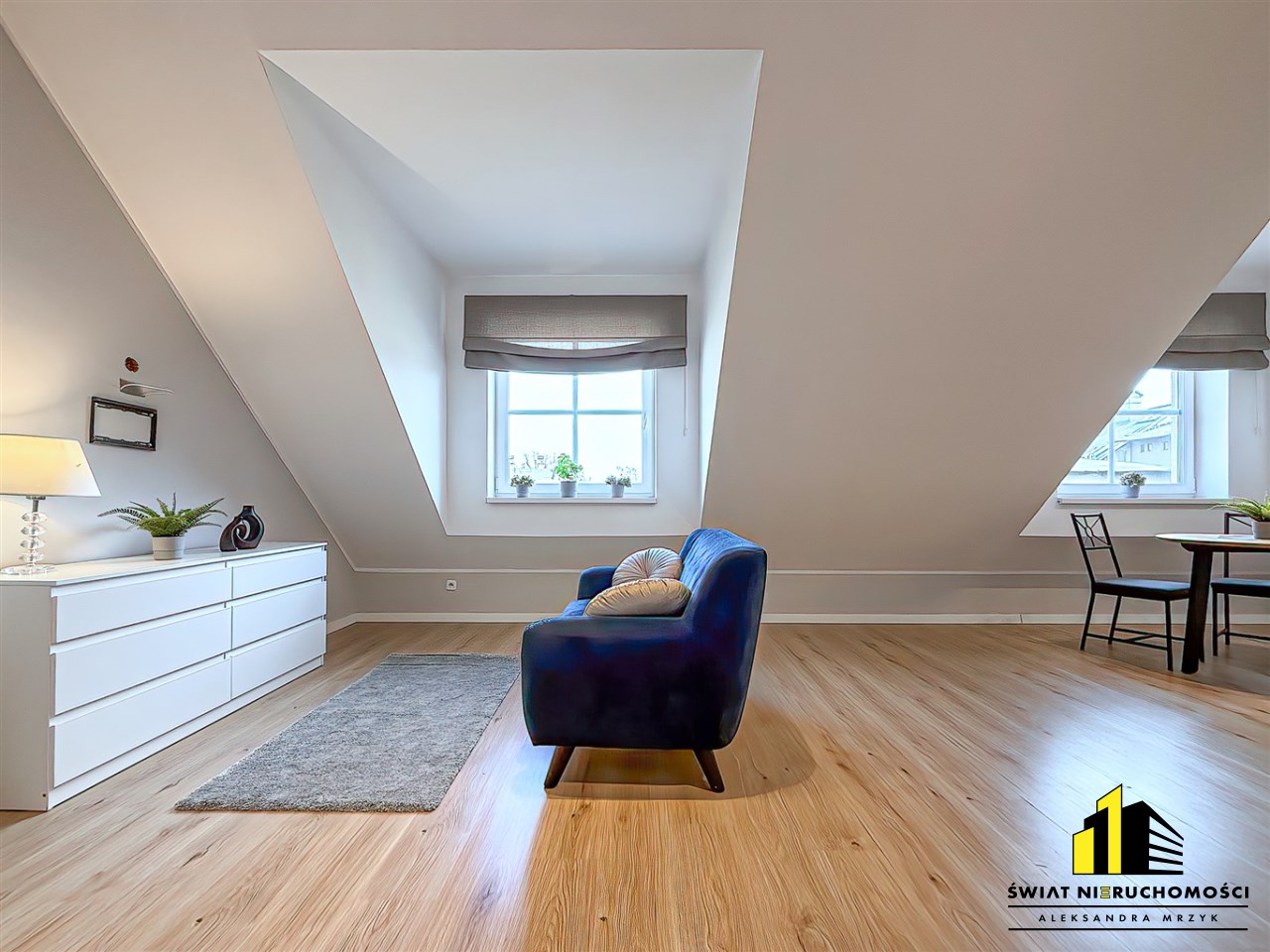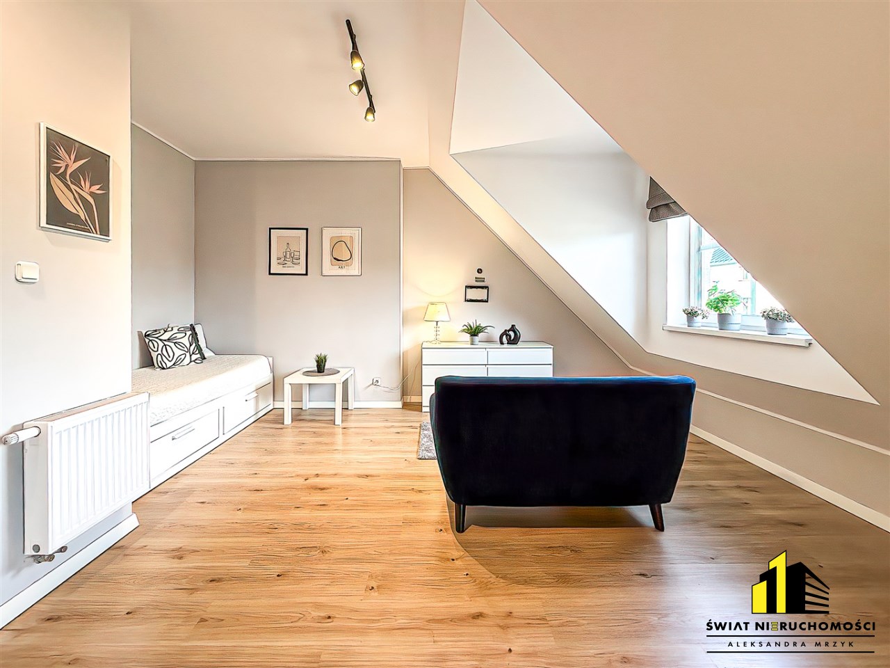 Mieszkanie zlokalizowane jest na poddaszu. Lokal jest jasny i przytulny, a duże okna zapewniają dobre doświetlenie pomieszczeń. Wnętrze zostało wykończone w neutralnym stylu, co pozwala na łatwą aranżację według własnych potrzeb.